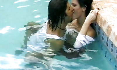 Busty and fine classic hot gals by the pool get into each other